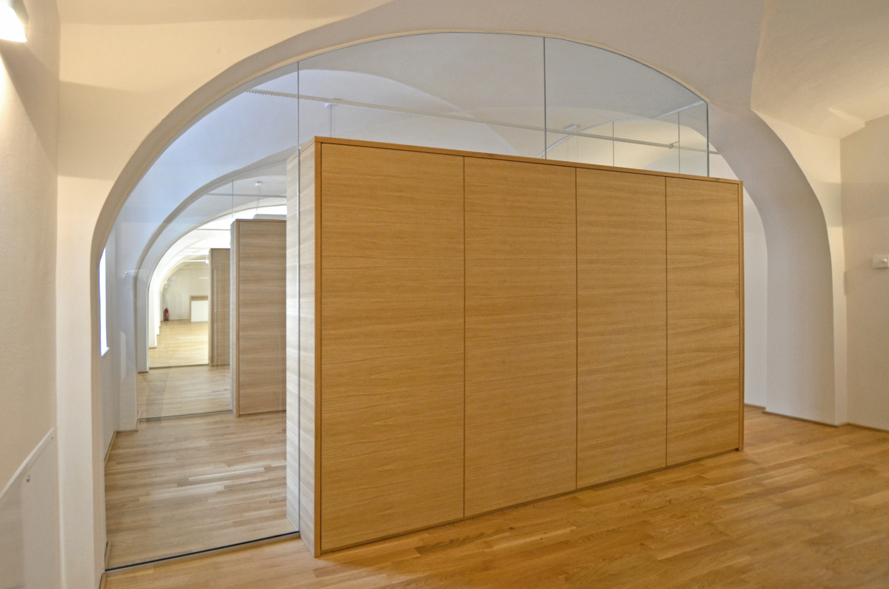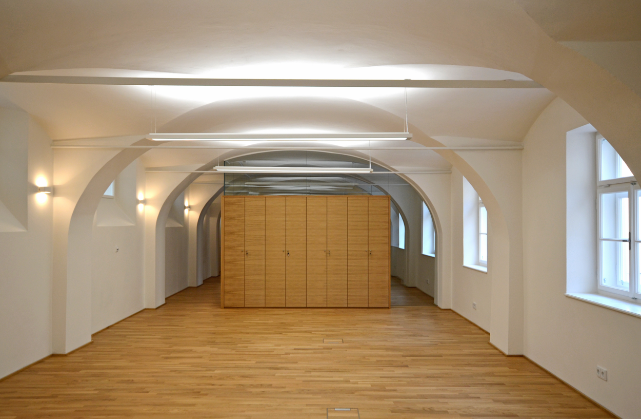 Die Räume der bestehenden Tischlerei sollen umgebaut und Büroräumlichkeiten geschaffen werden. Es sind insgesamt 7 Büroräume und ein Besprechungsraum im Erdgeschoß geplant. Die bestehenden Räume ( Aufenthaltsraum und Lagerraum ) im Dachgeschoß bleiben unverändert. Der Eingang erfolgt direkt in das neu geschaffene Stiegenhaus. Um die Raumstruktur des großen Gewölberaumes an der Pfeifergasse weiter erlebbar zu machen werden die neuen Bürozwischenwände als Möbelleichtbaukonstruktion ( Holz-Glaselemente ) mit einem oberen Glasfeld als Gewölbeanschluss hergestellt.